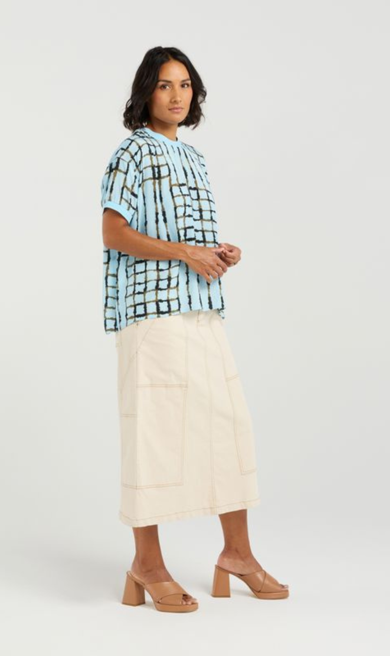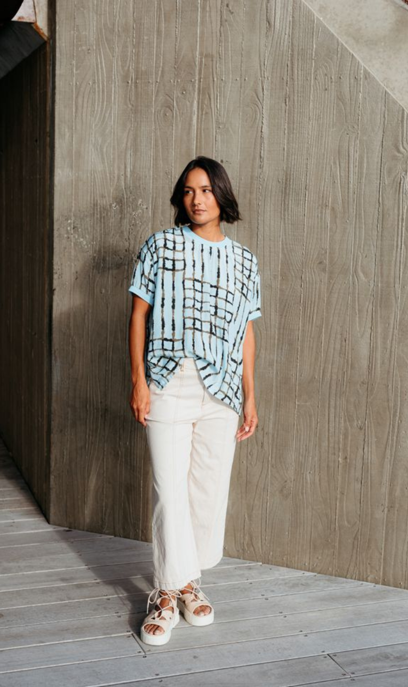 Check out our gorgeous Skyline Plaid print t-shirt style top. With its gorgeous print and striped knit trim, it is the perfect blend of style and comfort for your everyday fashion needs. It pairs back perfectly with your fav denim, pants or shorts for cute casual summer style.