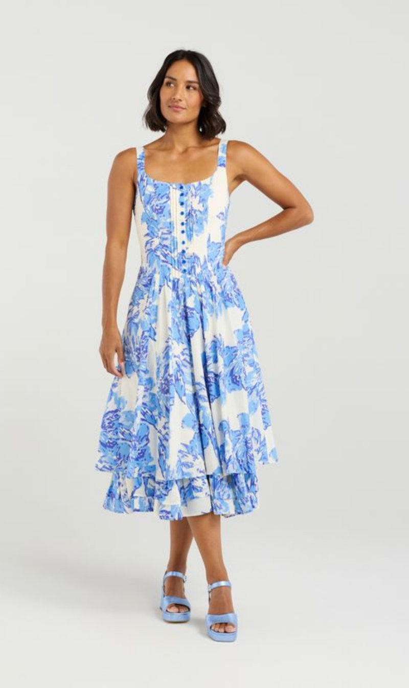 Floaty, flirty, and full of charm—this strappy dress is made for twirling. With a fitted bodice and smocking at the centre back, it hugs you in all the right places while keeping things comfy. The full skirt, complete with dreamy underlayers, adds just the right amount of volume and movement. Perfect for sunshine days, garden parties, or anytime you want to feel a little extra magical.