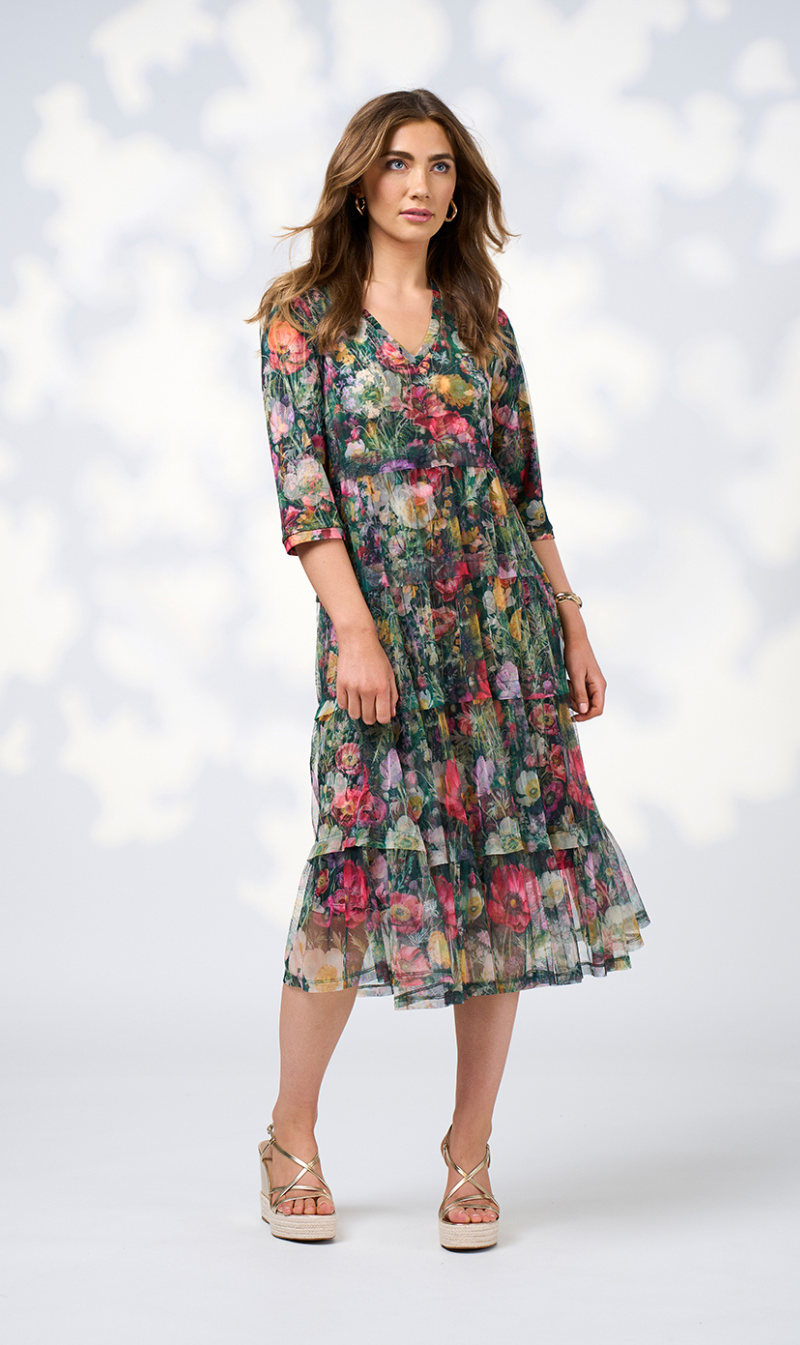 Printed tiered tulle dress with a V neckline and 3/4 length sleeves. Gathered tiers feature a tuck at the top edge of seams. Fully lined.
