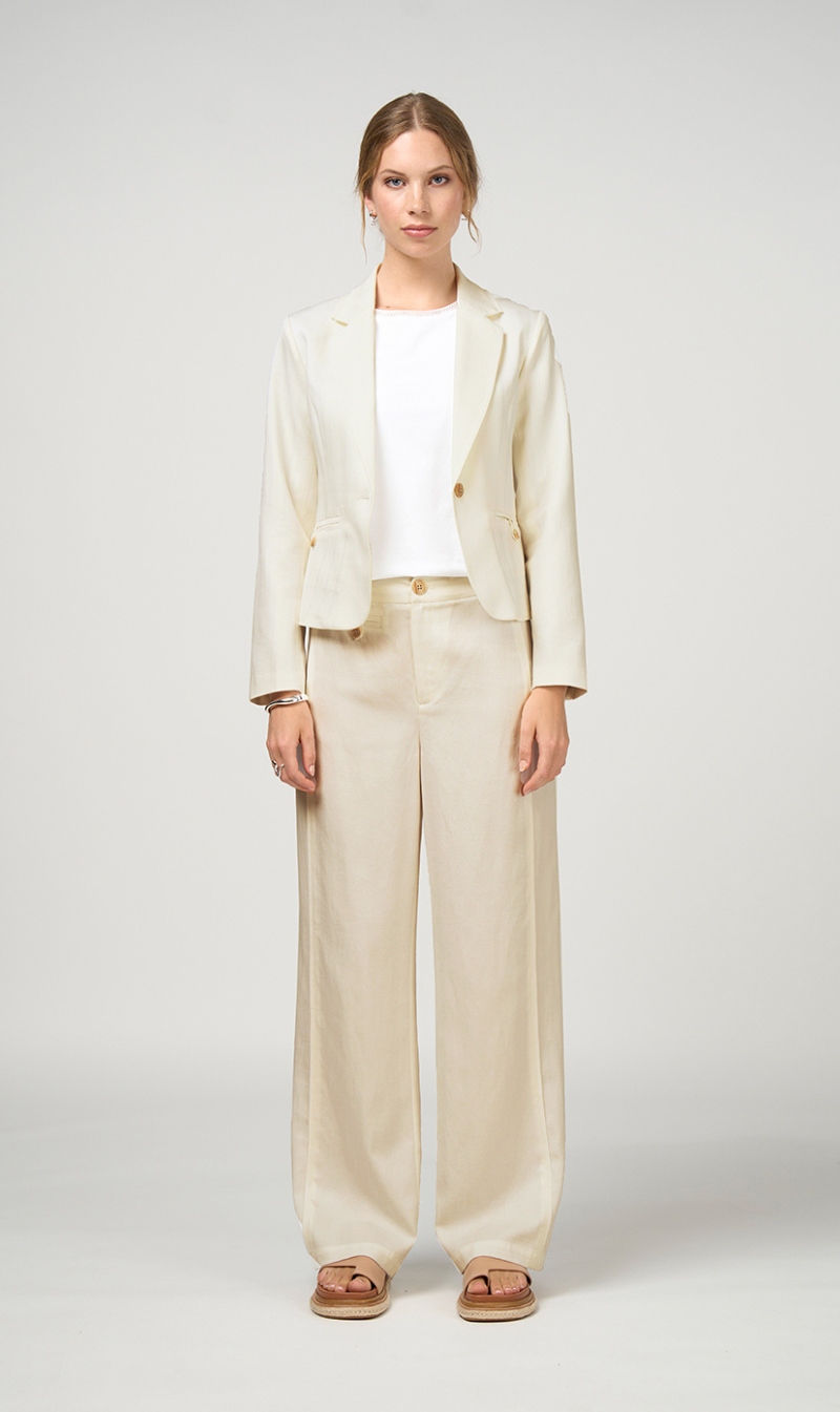 The Meridian Jacket from Madly Sweetly is a slim fit tailored jacket, with double jet pockets with buttons, featuring flat piping detail inserted at the collar edge, outer sleeve and side back waist line. Fully lined with functional pockets.
