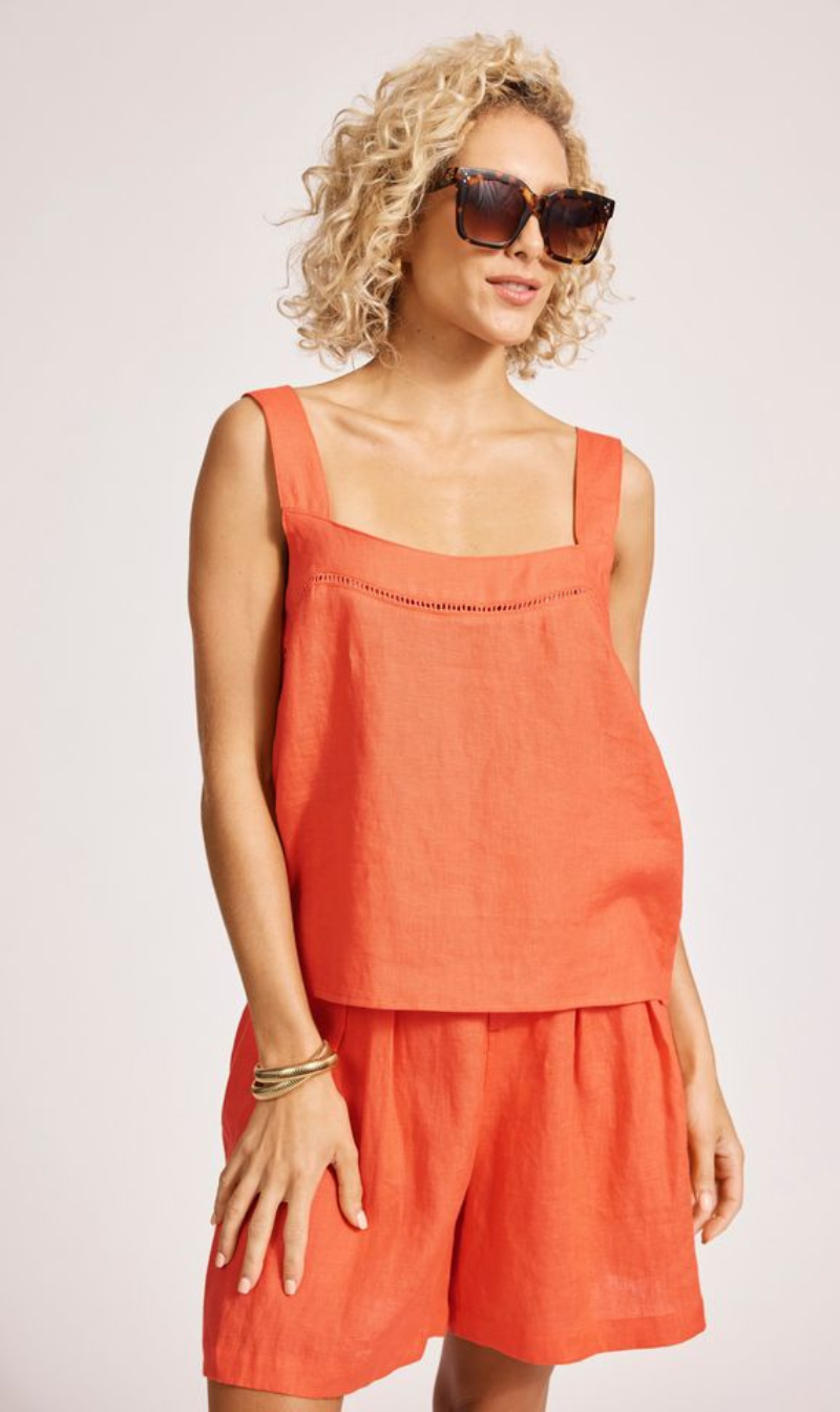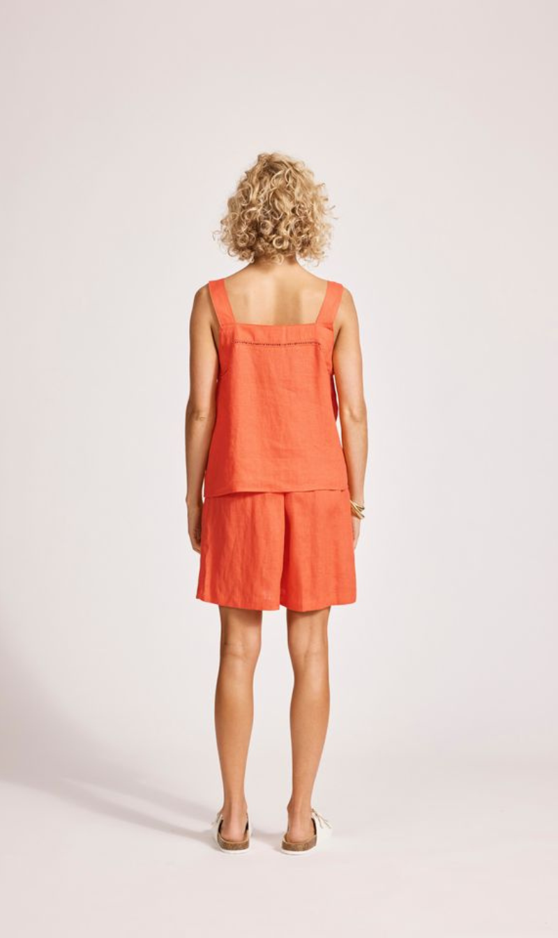 A relaxed linen tank with refined detailing. Crafted from 100% linen for breathable comfort. Features exposed shoulders, contrast decorative topstitching, button closure at the back neck, wide cuffed hem, and soft A-line silhouette.
