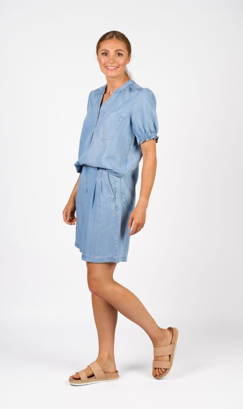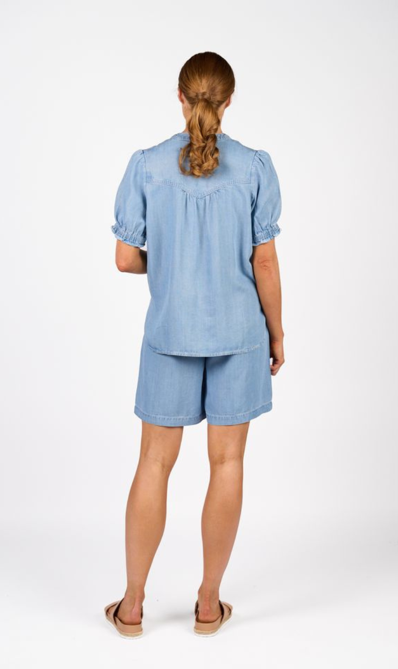 The Naomi Top is a relaxed summer favourite made from a soft, lightweight tencel fabric with a denim look. It features short puffed sleeves with shirring at the cuffs, a V-neck with a flat mandarin collar, and a button-up chest. The softly rounded hem dips lower at the back for easy, laid-back style.