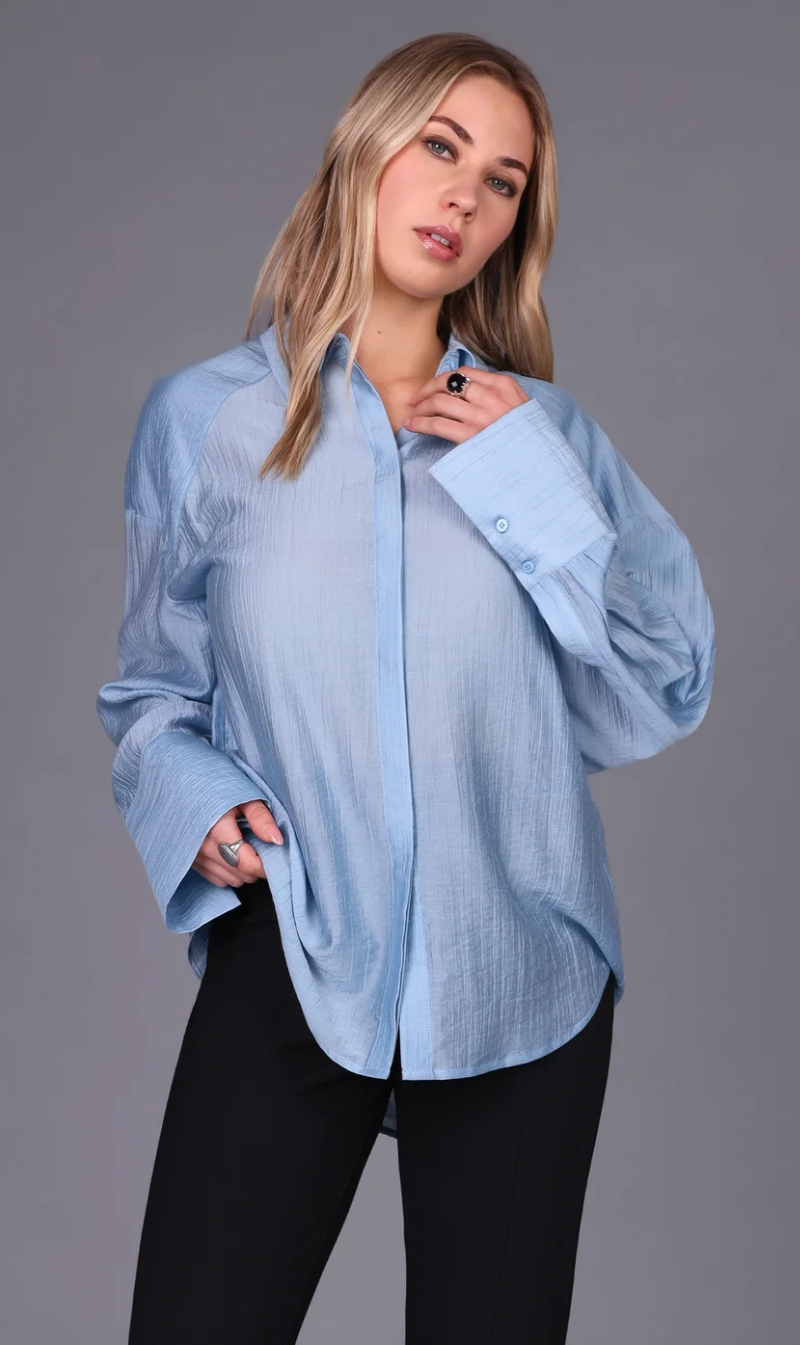 Featuring a classic collar neckline, button front, and relaxed fit oversized silhouette, along with relaxed fit sleeves with fitted button wrist cuffs and a high-low front and back hem.