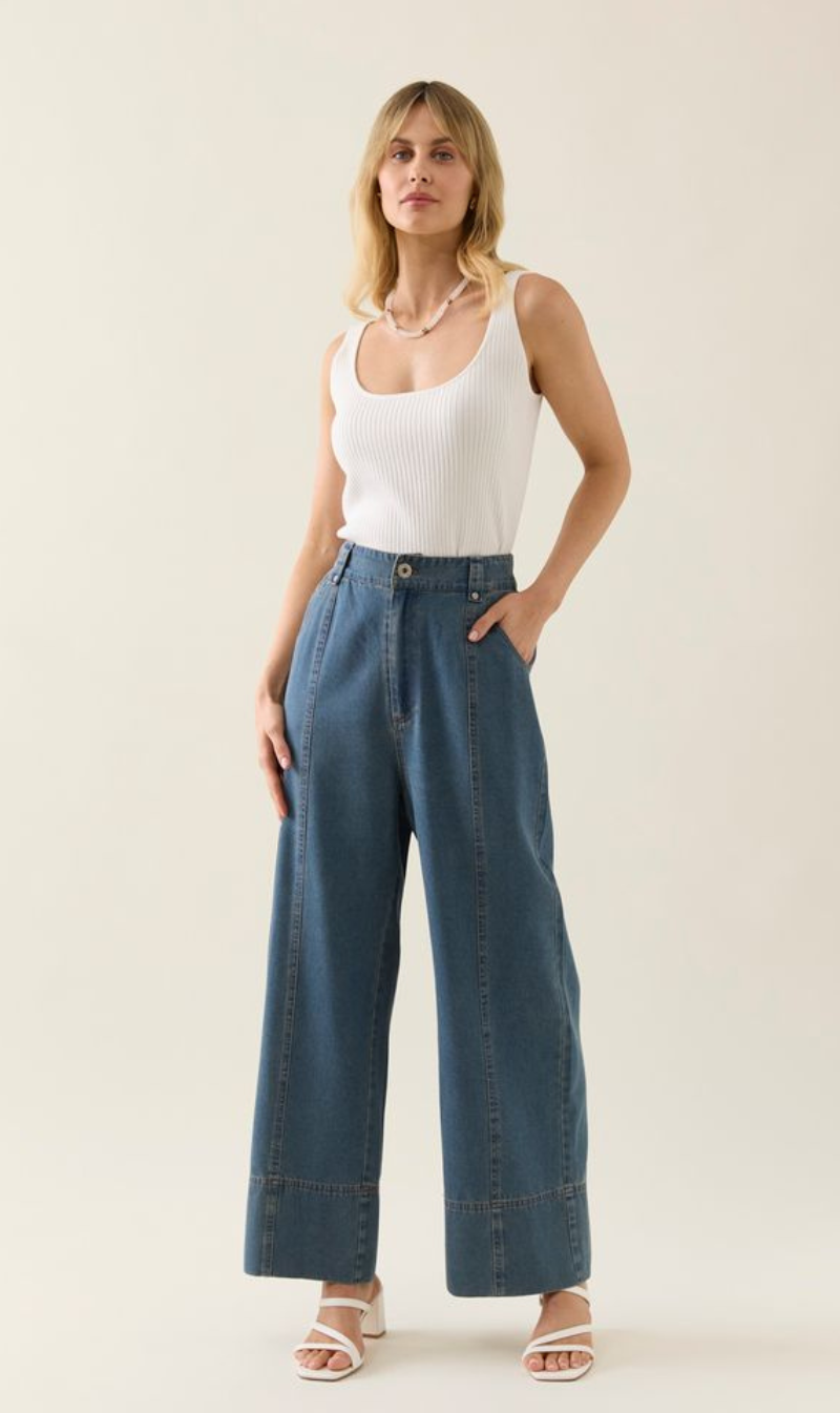 A full-length pant that balances ease with everyday elegance. Crafted from lightweight non-stretch denim, this style features topstitched front seams, a zip fly with an elasticated back waistband, and a wide hem finish for a flattering silhouette.