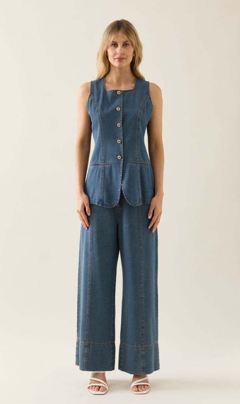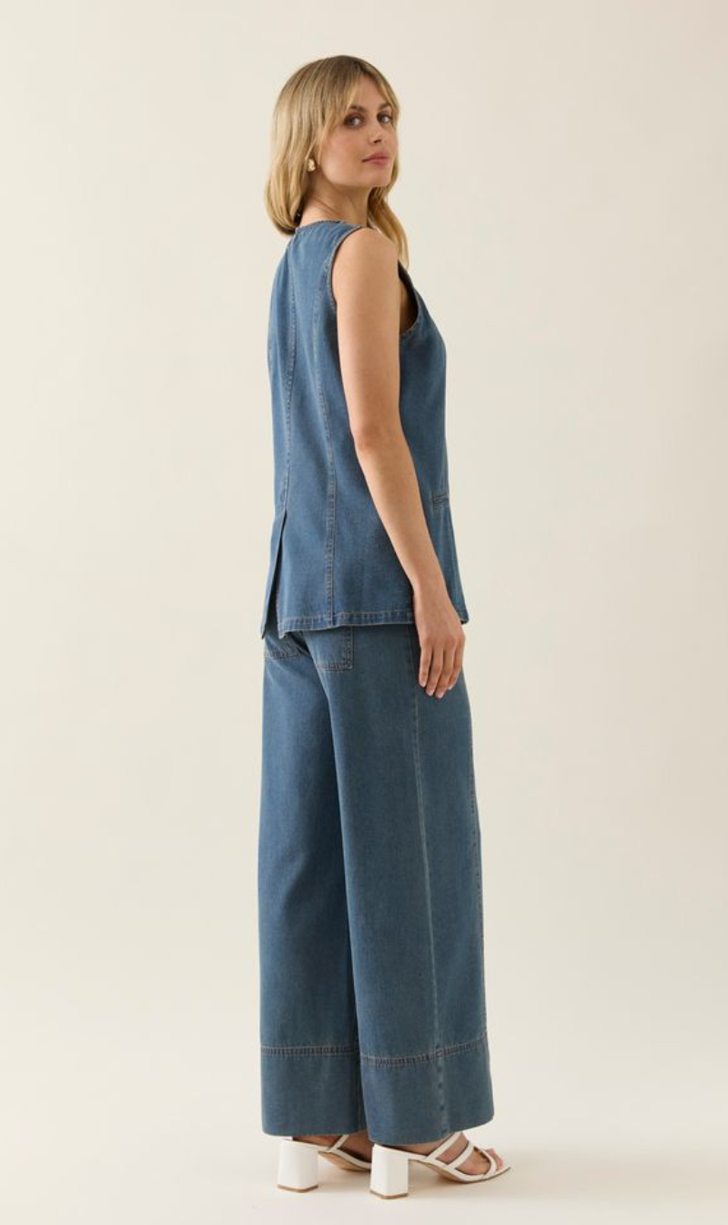 Tailored for a flattering silhouette, the Sofie Denim Vest is crafted from lightweight 100% cotton denim. Features a high square neckline, shaped panel seams, button-through front and faux welt pockets.
